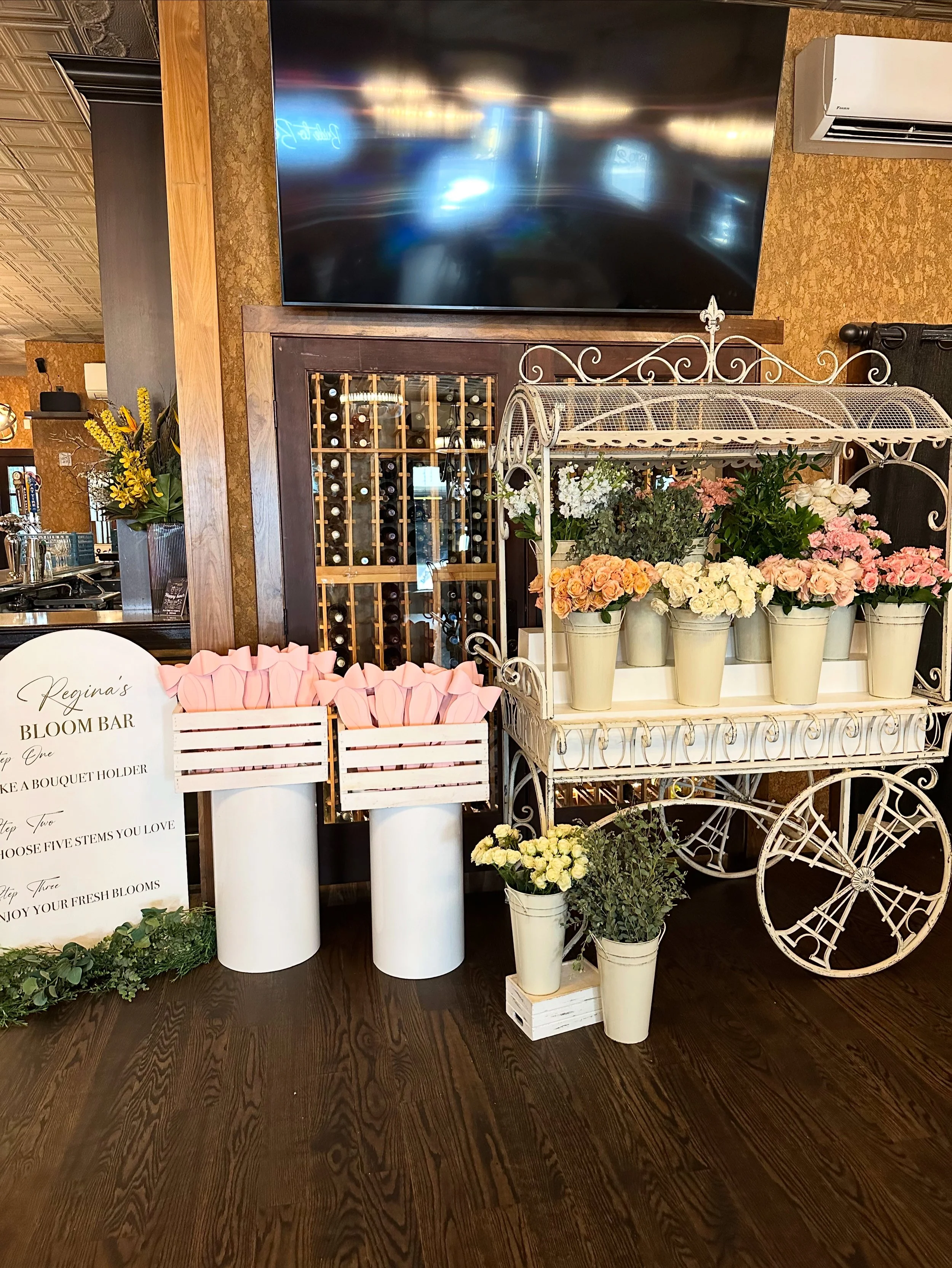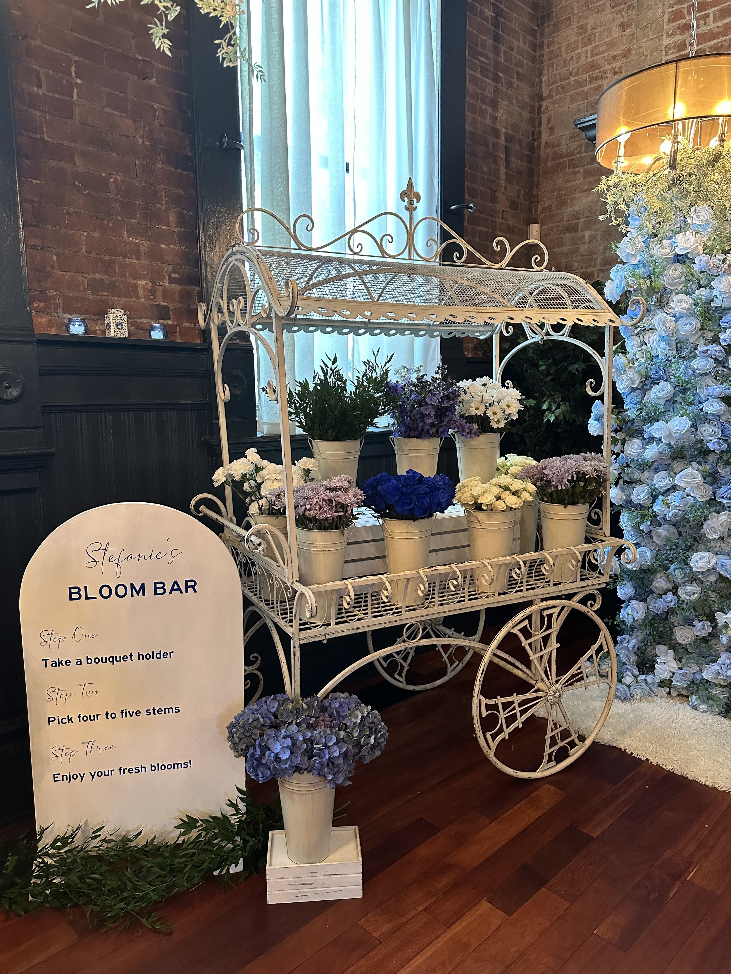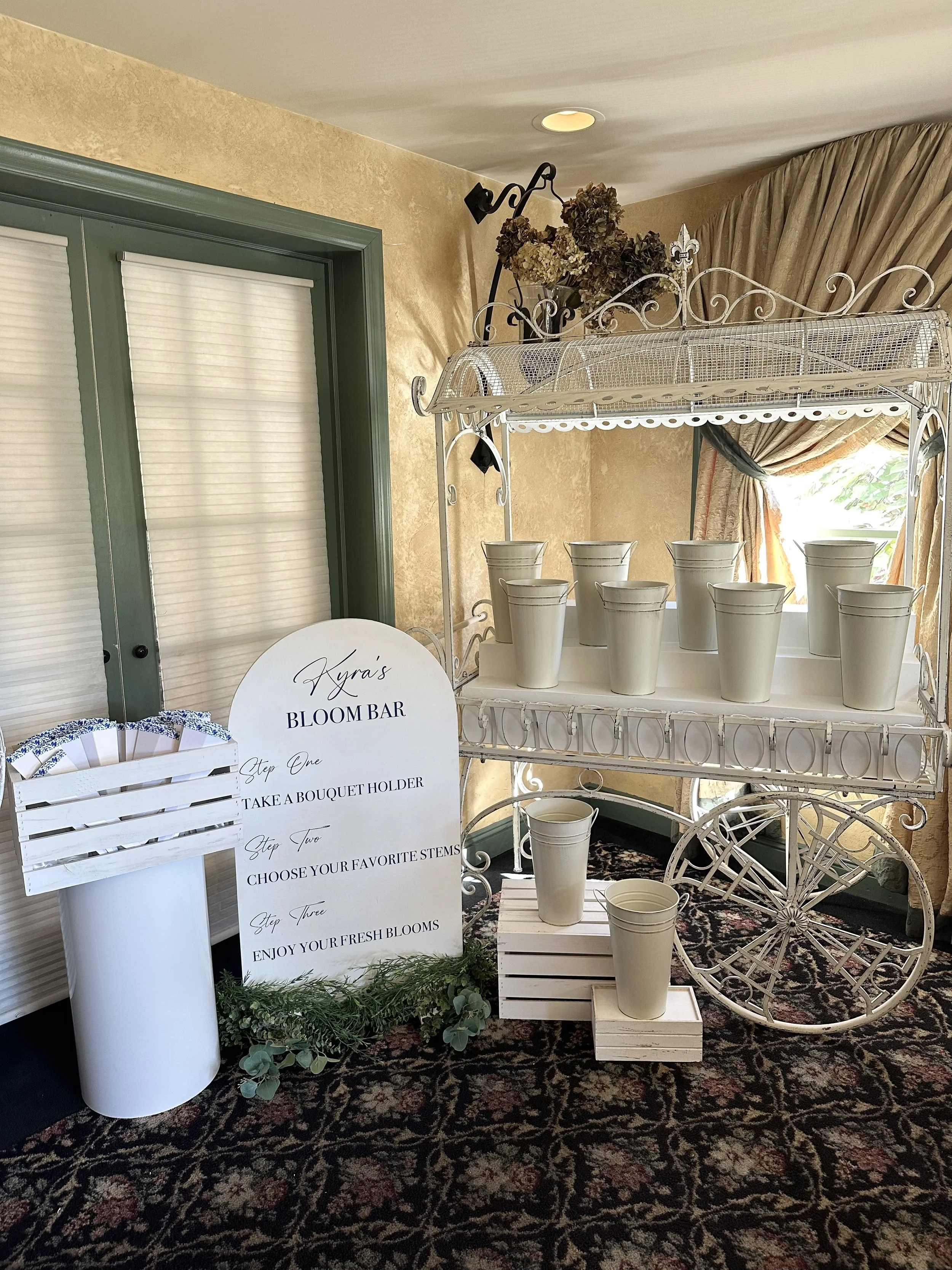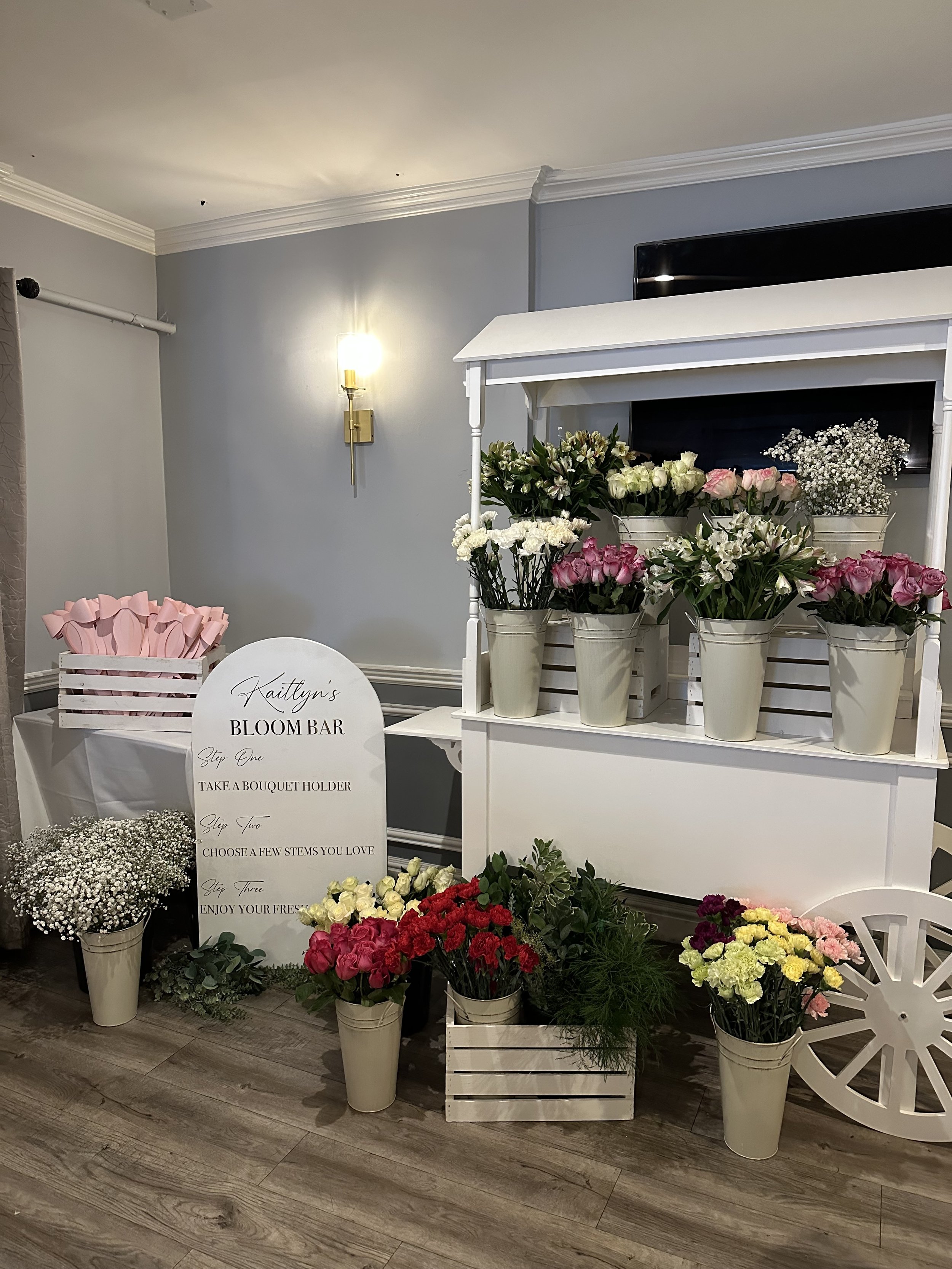 Includes all materials for the bloom bar experience, except client provides their own flowers. Custom floor instruction sign